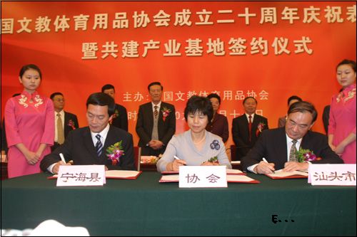 2009年10月11日,在人民大会堂举办的中国文教体育用品协会成立二十周年庆祝表彰大会上,中国文教体育用品协会与广东汕头市人民政府、浙江宁海县人民政府三方共同签署协议,共同建设汕头文具生产基地和宁海县文具产业基地。